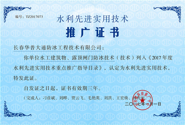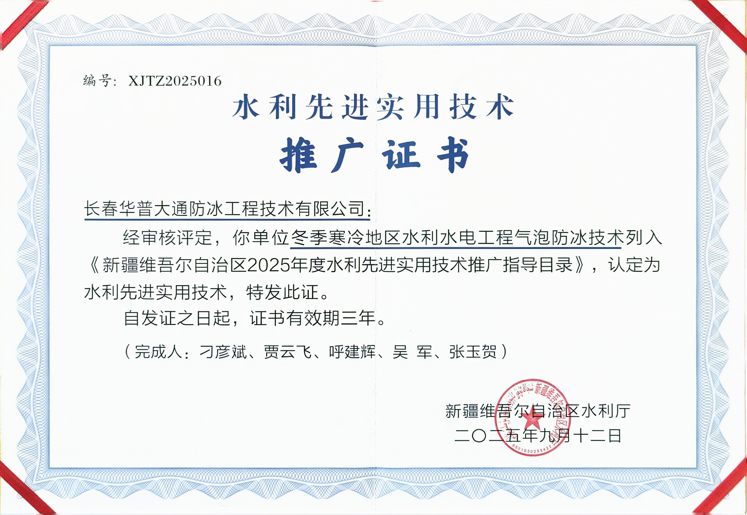 公司在水利水电工程专业领域具有前瞻性与独创性,在解决高纬度寒冷地区水利水电工程、抽水蓄能电站、交通运输工程桥梁、北方结冰区域港口、码头等冬季受冰荷载破坏技术难题上,拥有多项核心专利技术,开创了该领域新技术、新方法。2016年,由水利部组织,以胡春宏院士为组长,多位国内专家共同组成的评审组,对公司核心技术进行了评审。评审组专家评价“该技术与设备整体达到了国内领先水平。在水利水电、水运交通等领域具有较为广阔的应用前景。”该技术获得中华人民共和国水利部推广中心颁发的《水利先进实用技术推广证书》,被列入《2017年度水利先进实用技术重点推广指导目录》。