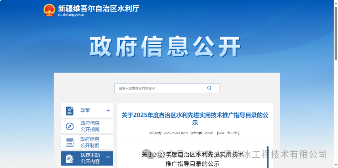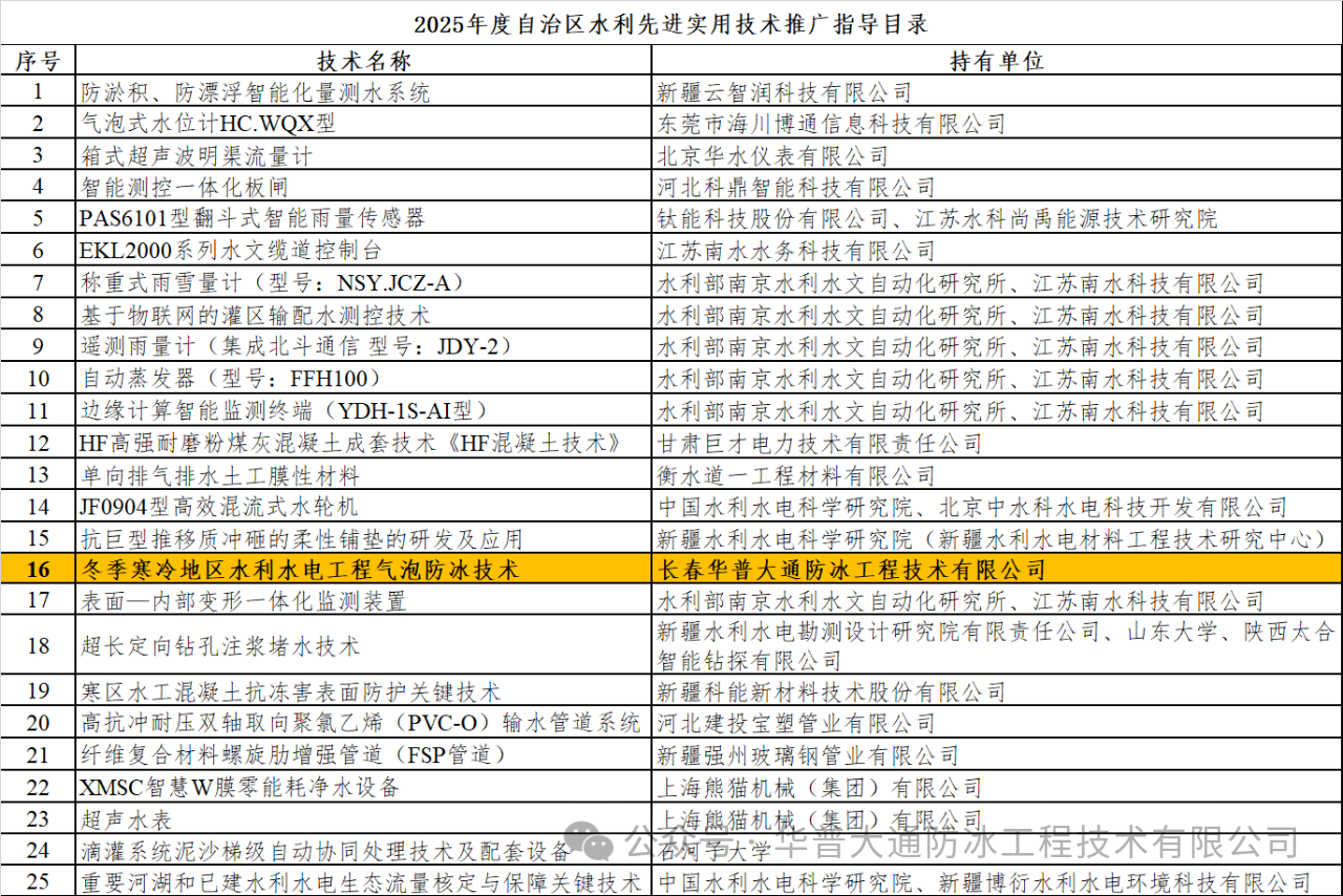 华普大通水利水电工程气泡防冰技术入选【新疆2025年度自治区水利先进实用技术推广目录】