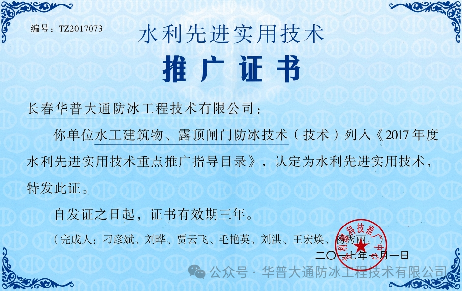 长春华普大通防冰工程技术有限公司在水利水电工程防冰技术领域有着诸多关键技术与成功案例。随着技术的日臻成熟、设备的升级以及行业主管单位、专家的认可和推广,该技术在解决严寒地区水利水电工程冰害问题上将会发挥越来越大的作用。
