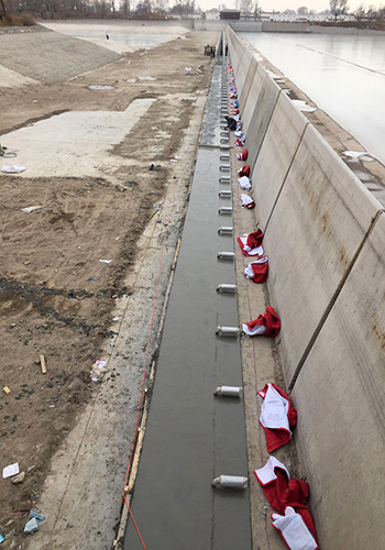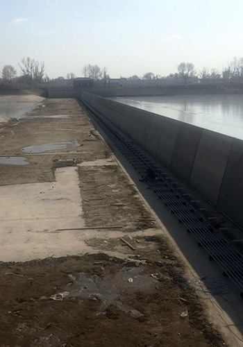 2016年12月,呼和浩特大黑河综合治理管理局元局长带队,并有黄委设计院参加的闸门防冰冻考察团来到长春,对我司的新型专利技术产品-气泡防冰设备给予了充分肯定。2017年9月,呼和浩特大黑河杀虎口大桥至蒙牛大桥段防洪及景观工程7#挡水闸防冰冻项目正式启动,经呼和浩特市财政局批准,呼和浩特市公共资源交易中心受呼和浩特市水务局的委托,采用单一来源方式采购防冰冻设备。7#挡水闸闸门形式为液压升降坝,总跨度288m,冬季极端最低温度可达-26℃(2011年至今),全长288m跨度方向全部采用我司最新的气泡防冰设备运行,每扇闸门门叶前均能够实现一致的防冰区域及防冰效果。整套气泡防冰设备运行稳定可靠,运行功率小,而且防冰效果显著,是近几年来能够从根本上解决寒冷地区水工建筑物及闸门冬季安全运行问题的且具备较高水平的新型防冰技术。