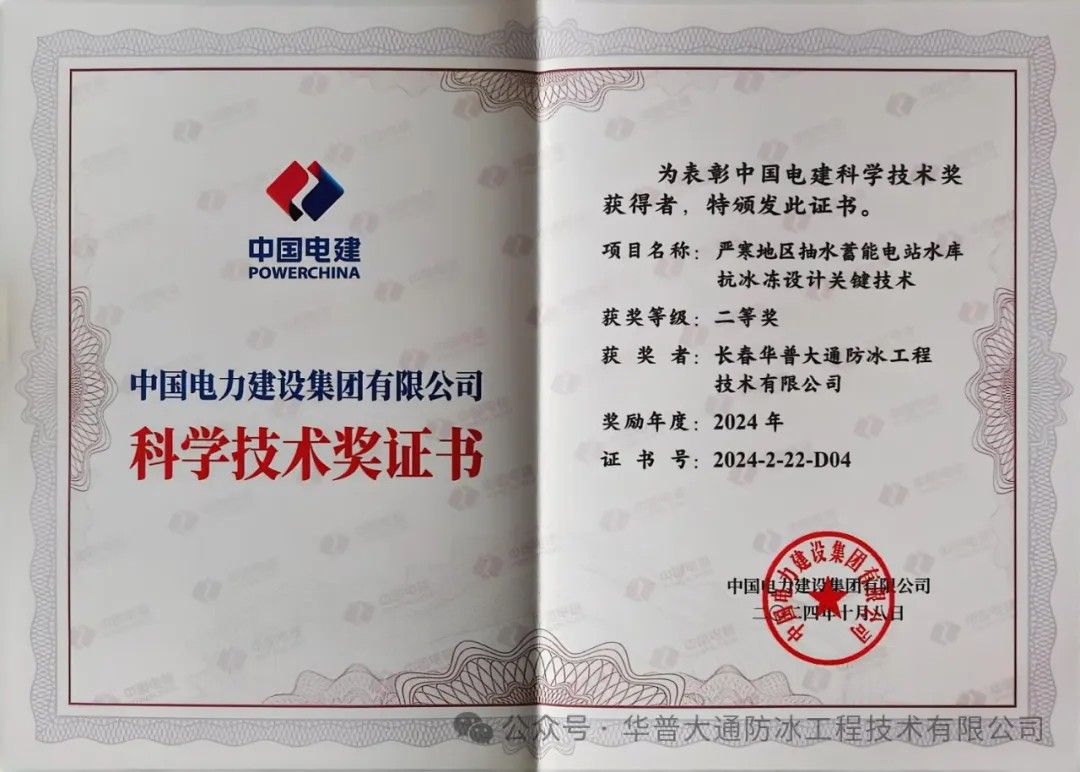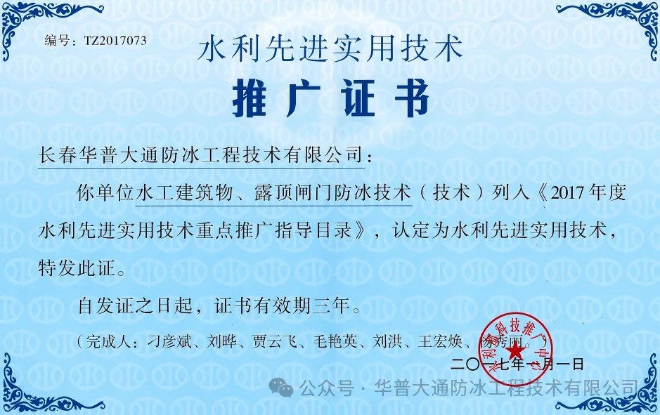 长春华普大通防冰工程技术有限公司成立于2016年,同年由水利部科技推广中心组织,由著名水利专家胡春宏院士为专家组长,并由多个国内知名专家共同组成的评审组对华普大通防冰冻核心技术进行了评审,专家一致认为:该技术在解决寒冷地区水利水电工程、交通桥梁、港口码头等冰冻难题上处于国内领先水平。水利部科技推广中心为华普大通颁发了《水利先进实用技术推广证书》,核心技术被列入《2017年度水利先进实用技术重点推广指导目录》。